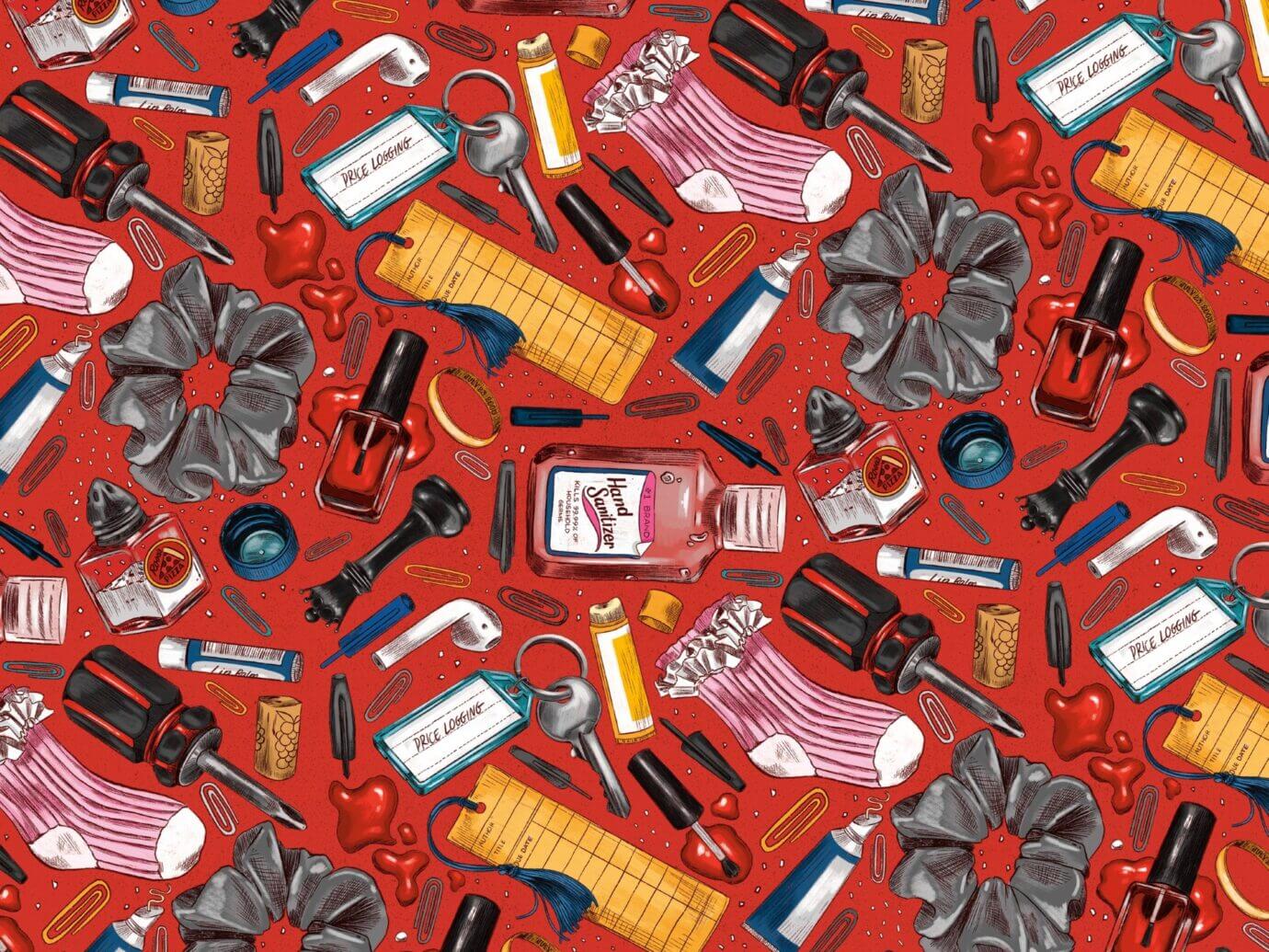 Of all the editions, my favorite component is the 4 color custom endpapers on the B&N edition! I was able to hire an artist I’d been admiring on Instagram for a while – Halsey Berryman. I love her linework, and she does such a brilliant job of making a bunch of unrelated objects feel cohesive in a composition. Our main character Bel steals various items throughout the book and keeps them in a drawer in her room: nail polish, air pods, scrunchies, saltshakers, etc. I gave Halsey a list I pulled from the manuscript, and we also threw in a few nods to her family’s sinister secrets, maybe even the key to the mystery of her missing mother.