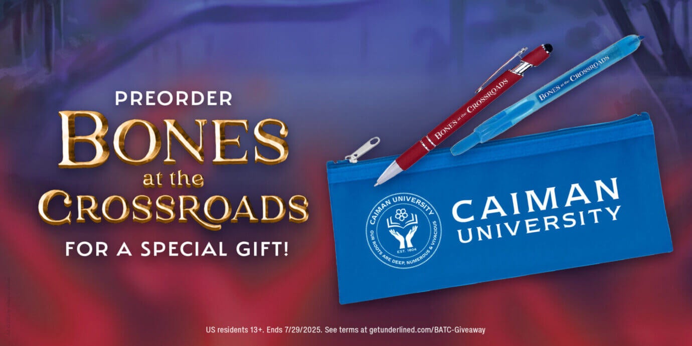 It’s time to go back to Caiman University! Fill out the form below with proof of purchase for your copy of Bones at the Crossroads before July 29, 2025, to receive a Caiman University zipper pouch, a pen, and a highlighter. While supplies last. See terms and conditions below.