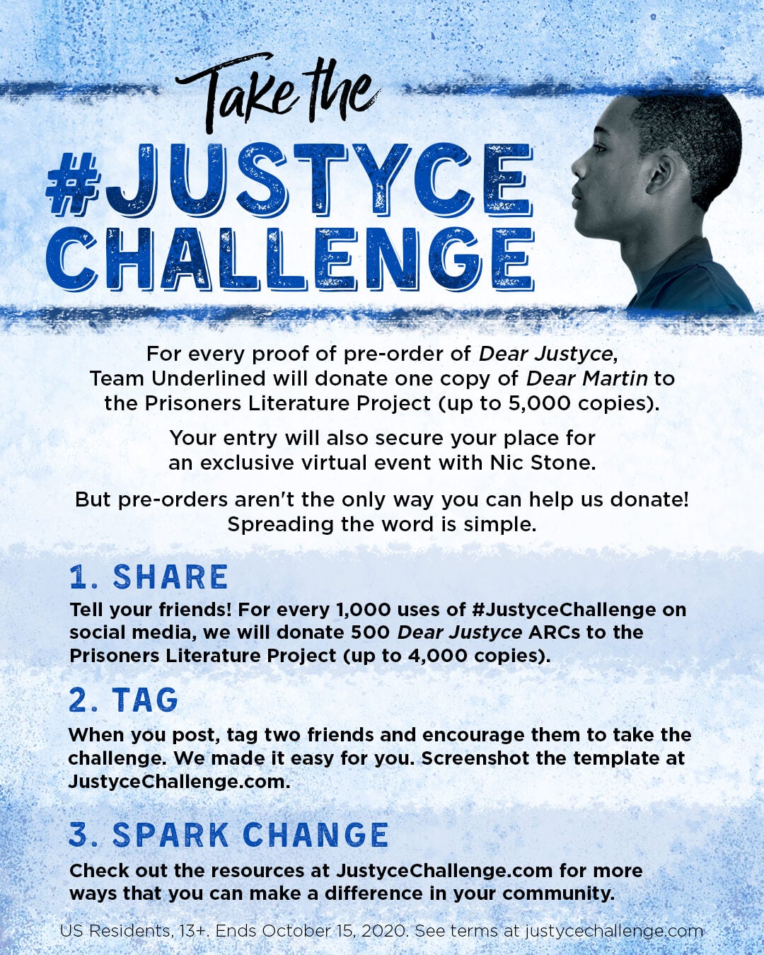 Tell your friends that you are joining the challenge! Pre-orders aren’t the only way you can help us donate! For every 1,000 uses of #JustyceChallenge on social media, we will donate 500 advance copies of Dear Justyce to the Prisoners Literature Project (up to 4,000 copies). Just make sure your posts are public!